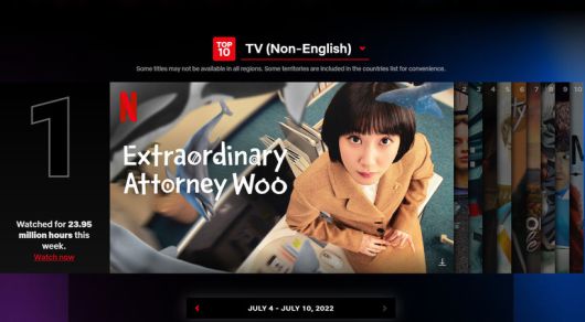 13일 넷플릭스 공식 차트에 따르면 ENA채널 ‘이상한 변호사 우영우’(연출 유인식, 극본 문지원, 제작 에이스토리·KT스튜디오지니·낭만크루)가 글로벌 TOP 10 TV(비영어권) 부문 1위에 오르며 저력을 과시하고 있다.