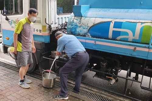 단수 사고 현장서 수돗물 공급하는 급수차량 |