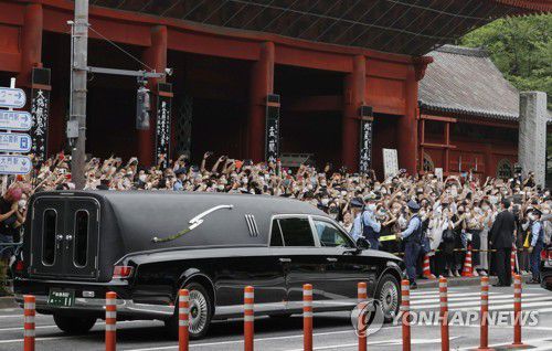 장례식이 열린 도쿄 사찰서 출발하는 아베 운구차 |