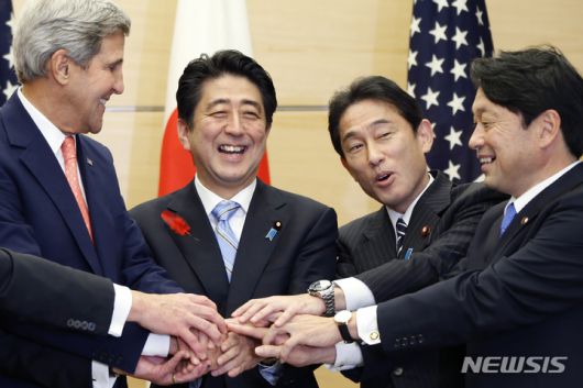 [도쿄=AP/뉴시스]2013년 10월 도쿄에서 일본의 아베 신조 전 총리(왼쪽에서 두 번째)와 당시 외무상이던 기시다 후미오 현 총리(오른쪽 두번째), 오노데라 이쓰노리 방위상이 존 케리 전 미국 국무장관과 회담했다. 2013.10.3. |