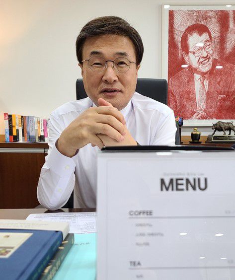 김대식 경남정보대 총장이 집무실에서 대학 목표를 얘기하고 있다. 책상 위에 메뉴판이 눈길을 끈다. /김용우 기자 kimpro7777@ |