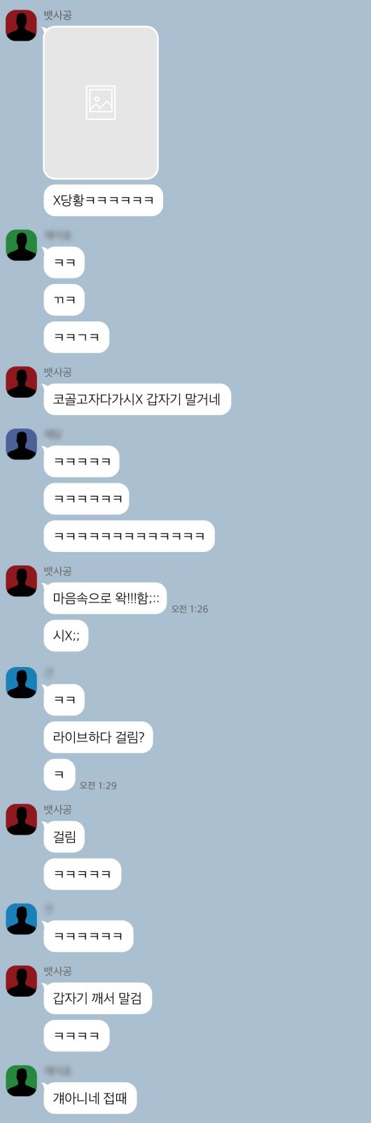 뱃사공은 A씨가 잠든 사이 홀로 SNS 라이브 방송을 하던 중, A씨가 잠결에 낸 소리에 당황해 황급히 방송을 끄고, 지인들이 있는 단톡방에 "역대급 당황"이라는 글을 올렸다. 그러자 리짓군즈 소속 래퍼 000은 "성방(성인방송) 스타일"이라고 말했고, 또 다른 래퍼 000는 "출장(성매매) 부른 줄"이라고 답하며 웃었다.