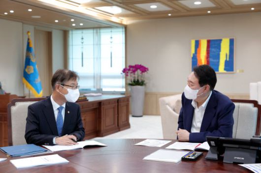 윤석열 대통령과 이정식 고용노동부 장관 - [서울=뉴시스] 윤석열(오른쪽) 대통령이 15일 서울 용산 대통령실 청사에서 이정식 고용노동부 장관으로부터 업무보고를 받고 있다. (사진=대통령실 제공) 2022.07.15. photo@newsis.com |