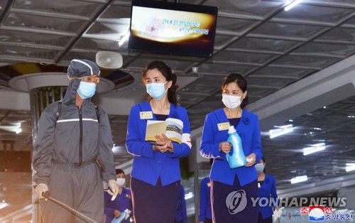 북한 평양지하상점 소독하는 종업원들 |