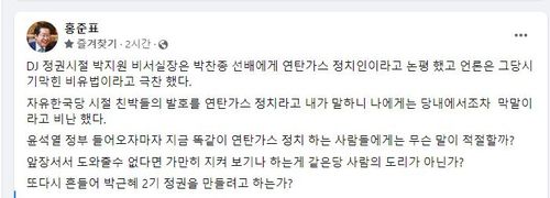 홍 시장은 "앞장서서 도와줄 수 없다면 가만히 지켜보기나 하는 게 같은 당 사람의 도리가 아닌가"라며 "또다시 흔들어 박근혜 2기 정권을 만들려고 하는가"라고 반문했다.