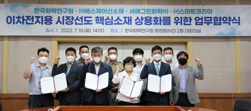 (대전=연합뉴스) 김준호 기자 = 한국화학연구원과 에스제이신소재·서해그린화학·스마트코리아 등 3개 기업은 18일 전기차 주행거리 향상을 위한 고용량 이차전지 음극재 생산 업무 협약을 체결했다.
