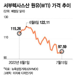 18일 뉴욕상업거래소(NYMEX)에 따르면 15일 기준 8월 인도물 서부텍사스산 원유(WTI)는 배럴당 97.59달러에 거래를 마쳤다. 한 달 전 즈음인 6월 8일 기록한 연고점(122.11달러) 대비 20.1%(24.52달러) 하락한 수준으로, 지난 12일(95.84달러)부터 100달러 선을 밑돌고 있다.