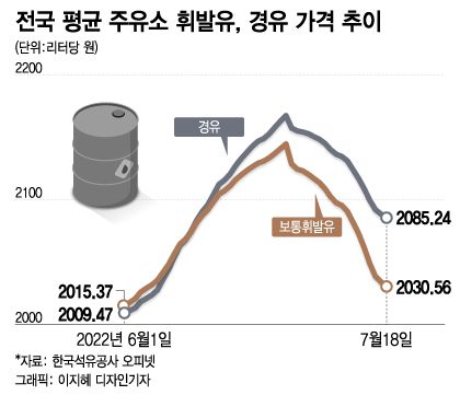 한국석유공사의 유가정보사이트 오피넷에 따르면 이날 정오 기준으로 전국 주유소 평균 휘발유 가격은 ℓ당 2030.56원이었다. 지난달 말인 6월 30일 기준 ℓ당 2144.90원에서 약 2주 만에 5.3%(114.34원) 떨어진 수준이다. 경유 가격은 ℓ당 2085.24원으로 6월 30일 기준 2167.66원 대비 3.8%(82.42원) 하락했다.