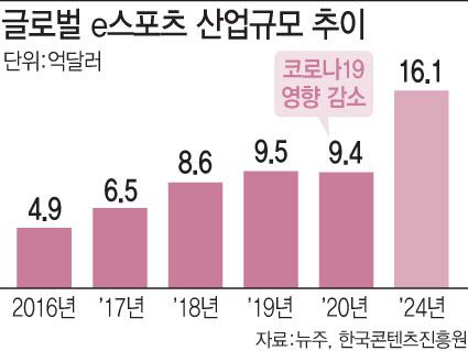 18일 게임시장조사업체 뉴주에 따르면 2020년 기준 글로벌 이스포츠 산업 규모는 9억4710만 달러(한화 약 1조2412억원)로 추정된다. 오는 2024년에는 16억1770만 달러(2조1135억원)로 연평균 11.1% 성장할 것으로 전망된다. 국내 이스포츠 산업은 2020년 기준 1204억원 규모다.