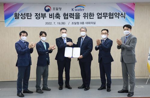 (대전=연합뉴스) 유의주 기자 = 조달청은 19일 정부대전청사 대회의실에서 한국수자원공사와 안전한 먹는 물 공급에 필수 품목인 활성탄의 정부 비축을 위한 업무협약(MOU)을 체결했다.