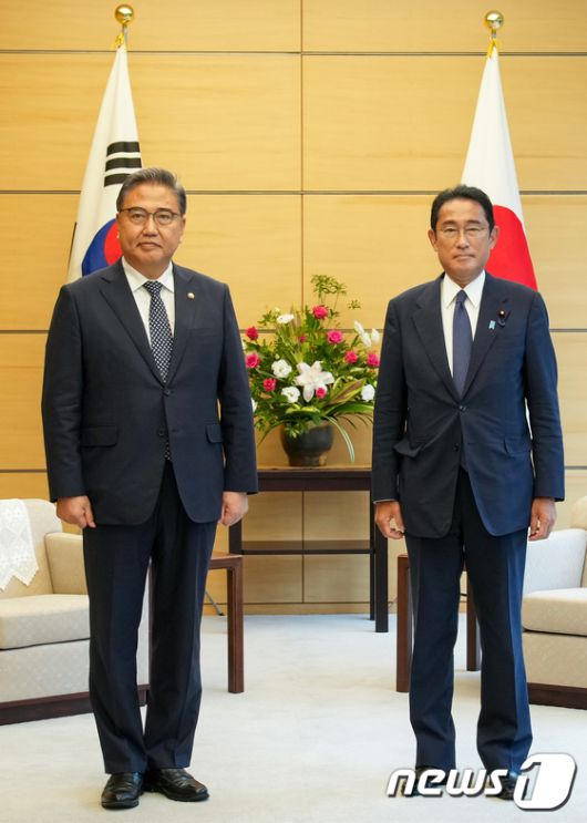 (서울=뉴스1) = 박진 외교부 장관이 19일 오후 일본 총리 관저에서 기시다 후미오 총리를 예방한 후 기념 촬영을 하고 있다.