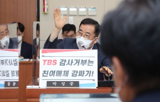 박성중 국민의힘 의원이 지난해 6월16일 국회 과학기술정보방송통신위원회 전체회의에서 ‘김어준의 뉴스공장’을 방송하는 <티비에스>(TBS)에 대한 감사 청구를 요구하고 있다. 연합뉴스 |