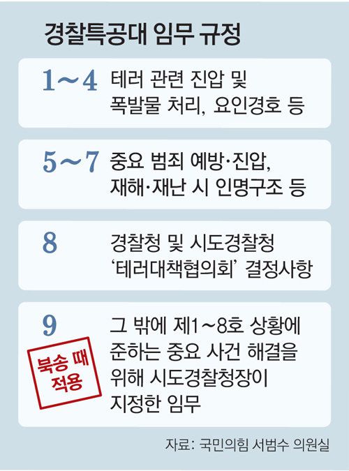 일각에선 경찰특공대의 탈북 주민 호송 임무 투입이 규정상 적절치 않았다는 지적도 나온다. 국민의힘 국가안보문란 실태조사 태스크포스(TF) 소속인 서범수 의원실이 경찰청으로부터 제출받은 자료에 따르면 경찰특공대의 평시 임무는 크게 9가지다. 1∼8번에는 테러나 재난·재해 발생 등으로 인한 위기 상황이 발생할 경우 투입할 수 있다는 규정이 있다. 마지막 9번 항목은 ‘1∼8번 항목에 준하는 중요 사건 해결을 위해 시도경찰청장이 지정하는 바에 따라 임무를 수행할 수 있다’고 돼 있다.