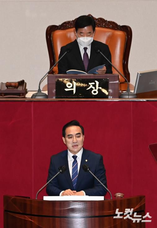 박홍근 더불어민주당 원내대표가 20일 서울 여의도 국회에서 열린 본회의에서 교섭단체대표연설을 하고 있다.