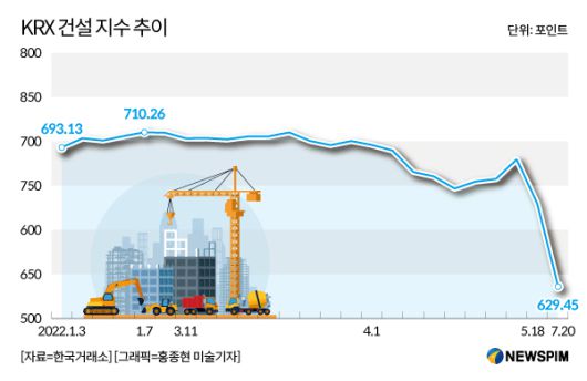 20일 한국거래소에 따르면 코스피 건설업 지수는 536%로 연초(1월 3일) 대비 157포인트(p)하락했다.
