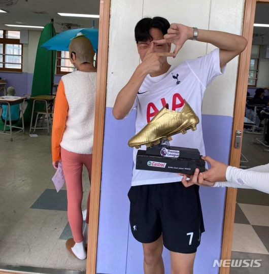 의정부고등학교 학생이 골든부트를 수상한 손흥민 의 '찰칵 세리머니'를 패러디하고 있다. 의정부고 학생자치회 제공 |