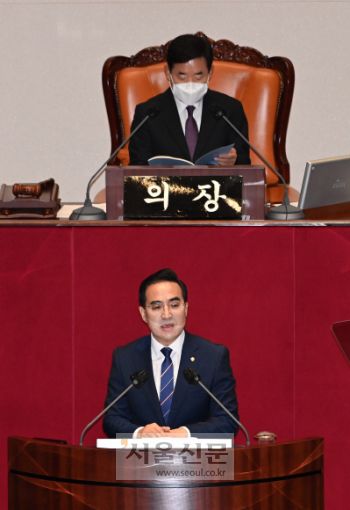 박홍근(아래) 더불어민주당 원내대표가 20일 국회에서 열린 제398회 임시국회 제2차 본회의에서 교섭단체 대표연설을 하고 있다.오장환 기자 |