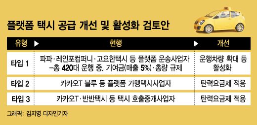 플랫폼 택시는 사업모델에 따라 타입 1,2,3으로 나뉜다. 기존 '타다'와 유사한 타입1은 사업자가 택시 면허가 없어도 되지만, 사회적 기여금(매출 5%)을 내고 총량 규제도 받는다. 타입2는 카카오T블루, 마카롱택시 처럼 플랫폼 사업자가 가맹 택시를 운영한다. 타입3은 카카오T, 반반택시 같이 택시호출 앱(애플리케이션)으로 운송 서비스를 중개하는 형태다.