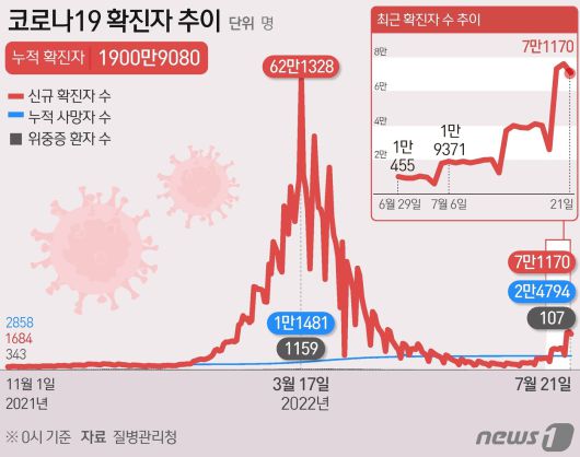 최근 2주일간(7월 8일~21일) 신규 확진자 추이는 '1만9305→2만270→2만396→1만2680→3만7346→4만252→3만9192→3만8865→4만1304→4만326→2만6282→7만3573→7만6402→7만1170명'으로 나타났다.