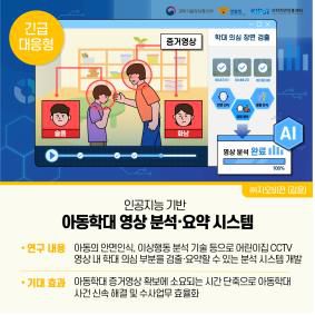 올해는 AI 기술을 활용해 어린이집 CC(폐쇄회로)TV에 녹화된 영상 중 아동학대 의심 장면을 빠르게 검색하거나, 사이버 공격 침해사고 간 공통점을 추출해 공격 주체를 신속하게 파악하는 등 4차 산업 혁명 기술을 적용하는 9개 연구과제를 신규 지원할 계획이다.