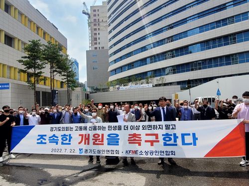 (수원=연합뉴스) 최찬흥 기자 = 경기도상인연합회와 경기도소상공인연합회 소속 회원 50여명은 22일 오후 경기도청 앞에서 집회를 열어 "경기도의회는 더 이상 고통에 신음하는 민생을 외면하지 말고 조속히 개원하라"고 촉구했다.