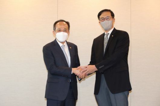 추경호 경제부총리 겸 기획재정부장관(왼쪽)과 이창용 한국은행 총재(오른쪽)가 16일 오전 서울 한국프레스센터에서 회동하고 있다. / 사진제공= 한국은행(2022.05.16) |