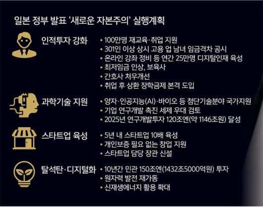 실행계획은 △인적투자 강화 △과학기술 지원 △스타트업 육성 △탈석탄·디지털화를 새로운 자본주의의 4개 축으로 제시했다. 정보기술(IT) 등 성장 분야로 인재이동을 촉진하기 위해 3년간 4000억엔(3조8200억원)을 투자하고, 남녀 임금격차를 줄이기 위해 301인 이상 상시고용 기업은 남녀 임금차를 공표하도록 했다. 인공지능(AI), 바이오 등에 대한 투자 확대, 탈탄소 분야에 대한 10년간 150조엔(1432조5000억원) 이상 민관 투자 등과 같은 구상도 제시했다. 스타트업 경영자는 본인 재산 담보 없이도 창업 시 대출을 받을 수 있도록 했다. 스타트업 육성담당 장관도 신설한다.