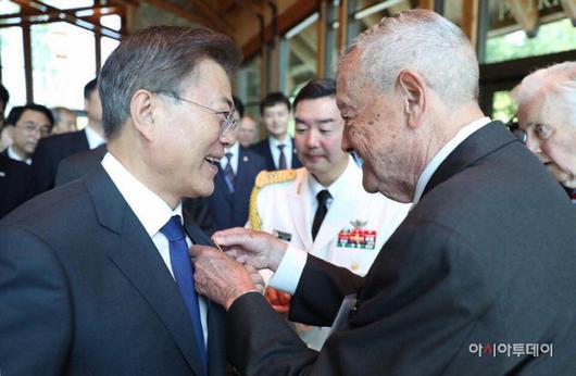 6·25 전쟁 중 장진호 전투에서 활약한 스티븐 옴스테드 예비역 미국 해병대 중장이 지난 2017년 6월 미국을 방문한 문재인 당시 대통령의 옷깃에 배지를 달아주고 있다. 옴스테드 예비역 중장은 20일(현지시간) 향년 92세를 일기로 생을 마감했다. / 페이스북 갈무리 |