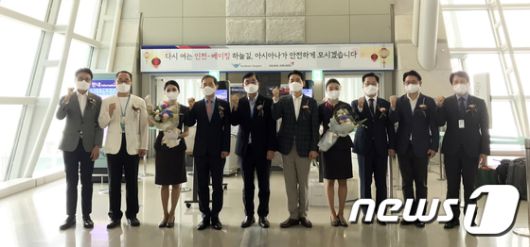 (서울=뉴스1) = 지난 23일 인천공항 제1여객터미널 23번 탑승게이트에서 열린 ‘아시아나항공 인천-베이징 노선 운항재개 기념행사’에서 김범호 인천국제공항공사 미래사업본부장(왼쪽 네 번째)과 두성국 아시아나항공 여객본부장(왼쪽 다섯 번째) 및 관계자들이 기념 촬영을 하고 있다. (인천공항공사 제공) 2022.7.25/뉴스1