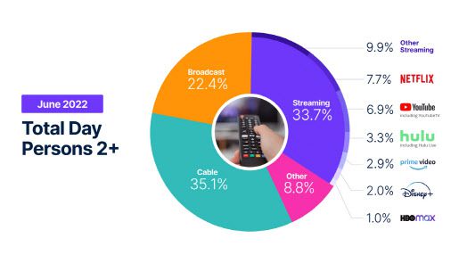 스트리밍 서비스 중에서는 넷플릭스가 7.7%로 가장 높은 점유율을 기록한 가운데 유튜브TV가 6.9%로 그 뒤를 바짝 좇고 있다. 훌루가 3.3%, 아마존의 프라임 비디오가 2.9%, 디즈니플러스가 2.0%, HBO맥스가 1.0%였다.