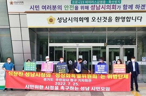 (성남=연합뉴스) 최종호 기자 = '시민을 위한 시정을 촉구하는 성남 시민모임'은 국민의힘 신상진 경기 성남시장이 시장직인수위원회 산하에 설치한 시정정상화특별위원회(이하 정상화특위)가 법령과 조례 등 설치 근거 없이 운영됐다며 25일 경기도에 주민감사를 청구했다.
