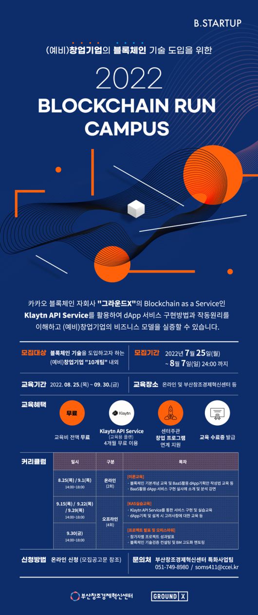 이번 교육은 부산창조센터의 특화분야인 블록체인 분야의 전문 인력을 양성하여 예비창업자로 육성하고, 스타트업이 기존 비즈니스에 블록체인 기술을 활용할 수 있도록 도움을 주는 실무중심의 교육 프로그램이다. 특히, 작년에 이어 카카오의 블록체인 기술 계열사인 ‘그라운드X’와 협업하여 비즈니스에 효과적으로 적용할 수 있도록 적극 지원할 예정이다.