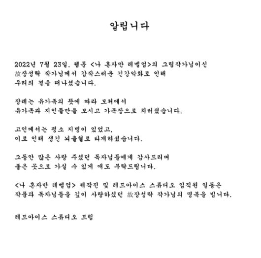 ▲ 장성락 작가의 부고를 알린 레드아이스스튜디오 공지문 (사진출처: 레드아이스스튜디오 공식 홈페이지) |