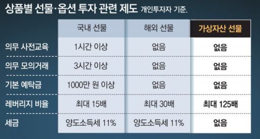 이처럼 투기성이 짙지만 투자자 보호 규정이 없어 20, 30대 등이 무분별하게 뛰어들고 있다는 지적이 나온다. 현재 개인투자자가 국내 선물 시장에 투자하려면 사전교육 1시간, 모의거래 3시간 등을 의무적으로 거치고 1000만 원 이상을 예탁해야 하지만 코인 선물은 이런 규정이 전무하다. 국내외 선물 상품에 물리는 양도소득세 11%도 적용되지 않는다.