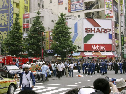 휴일인 2008년 6월 8일 낮 12시 30분께 도쿄 전철 아키하바라역 부근에서 벌어진 무차별 살인 사건 현장 모습. 살인범 가토 도모히로는 아키하바라역 부근 대로로 트럭을 몰고 돌진해 행인을 치고, 이후 차에서 내려 주변 쇼핑객을 흉기로 마구 찔러 행인 7명을 살해하고 10명에게 상처를 입혔다. 일본 법무성은 26일 오전 가토의 사형을 집행했다. /연합뉴스 |