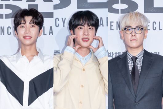 임영웅, BTS 멤버 진, 탑(왼쪽부터)이 25일 서울 삼성동 메가박스 코엑스에서 열린 영화 '비상선언' VIP 시사회에 참석해 포즈를 취하고 있다. /쇼박스 제공 |