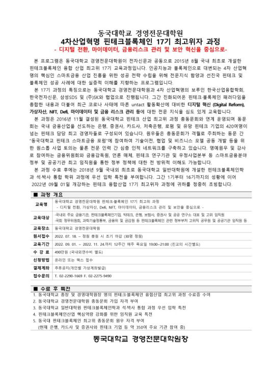 동국대학교가 제17기 핀테크블록체인융합산업 최고위자 과정을 개강한다. 핀테크 산업 진흥을 위한 성공전략과 블록체인 산업의 심도있는 정보 함양, 글로벌 핀테크 성공사례에 대한 실증 이해가 목표다.