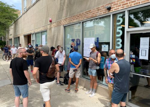 미국 일리노이주 시카고에 위치한 비영리 의료기관 앞에 남성들이 원숭이두창 백신을 맞기 위해 줄서 있다. 시카고/로이터연합뉴스 |