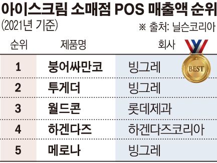 이와함께 소매점 POS 매출액 톱5에서 빙그레 제품은 3개(붕어싸만코, 투게더, 메로나)에 달하는데 비해 빙과업계 라이벌인 롯데 제품은 1개(월드콘)에 그치는 점도 주목할만하다.