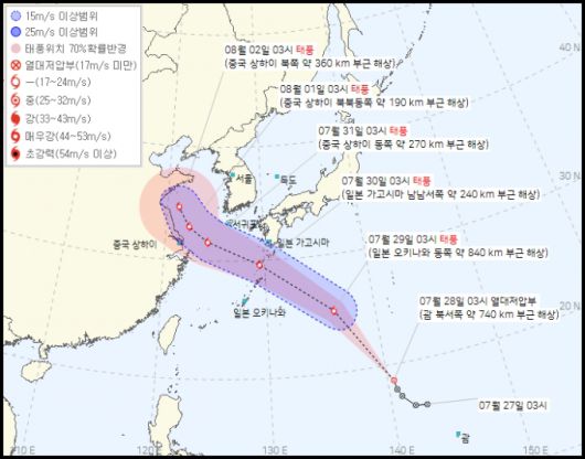 이 열대저압부는 오는 29일 오전 3시 태풍으로 발달해 일본 오키나와 동쪽 약 840㎞ 부근 해상을 지나 중국 상하이 부근으로 이동할 것으로 예상되고 있다. 이 과정에서 오는 31일 제주 먼바다에도 일부 영향을 줄 것으로 보인다.