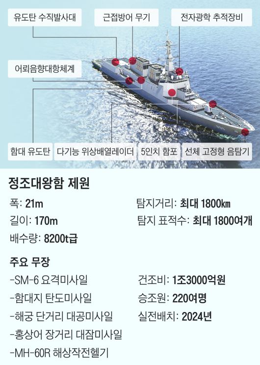 정조대왕함에는 SM-6 미사일 외에도 사거리 500~1000㎞에 달하는 국산 함대지(艦對地) 미사일과 국산 단거리 대공(요격)미사일 ‘해궁’, 장거리 대잠수함 미사일 ‘홍상어’ 등도 장착된다. 국산 함대지 미사일은 북한 핵·미사일 기지와 지휘 시설 등 북 전략 목표물은 물론 유사시 중국·러시아 등 주변 강국의 위협에 대한 ‘독침무기’ 역할을 할 수 있다.