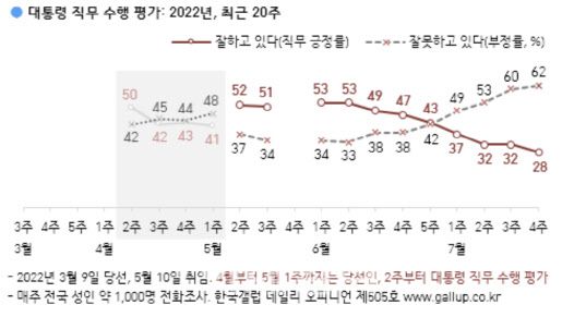 한국갤럽은 지난 26~28일까지 전국 만 18세 이상 1000명을 대상으로 조사(표본오차는 95% 신뢰수준에 ±3.1%포인트)한 결과 윤 대통령의 직무 수행 평가 ‘잘하고 있다’고 응답한 비율은 28%에 그쳤다. 전주와 비교해 4%포인트 하락한 수치다. 동시에 한국갤럽의 윤 대통령 지지율 조사 이래 최저치다. 윤 대통령의 직무 수행을 부정평가한 응답은 62%에 달했다. 전주와 비교해 2%포인트 상승했으며 5주 연속 오르고 있다. 부정평가가 긍정평가보다 높은 데드크로스 현상은 4주째 이어지고 있다. 긍·부정의 격차는 34%포인트로 더 벌어졌다. 국민의힘 지지층에서도 부정평가가 30%에 달하면서 지지층 이탈 현상도 가속화하는 모습이다.