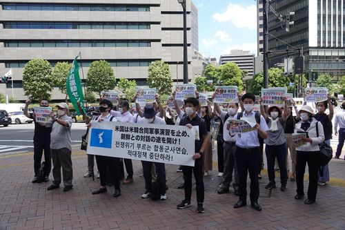 일본 사회단체 소속 회원 주일미대사관 주변서 한미연합훈련 반대 시위 |