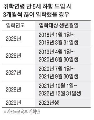 교육부는 만 5세 취학 연령 하향과 관련해 4년에 걸쳐 단계적 시행 방안을 예로 제시했다. 2018년생이 초등학교 1학년에 입학하는 2025학년도에 만 5세인 2019년 1~3월생을 추가로 입학시키고, 다음 연도에는 2019년 4~12월생과 2020년 1~6월생을 입학시키는 식이다. 또 교육부는 유치원과 어린이집 관리 체계 통합에 대해서는 유보통합추진단을 구성하기로 했다. 추진단을 통해 가장 먼저 유치원과 어린이집 교사의 자격 통합 작업이 이뤄질 것으로 전망된다.