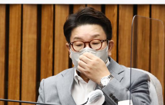 국민의힘 권성동 당대표 직무대행 겸 원내대표가 27일 국회에서 열린 국민의힘·부산·울산·경남 예산정책협의회에서 마스크를 만지고 있다. 김명국 기자 |