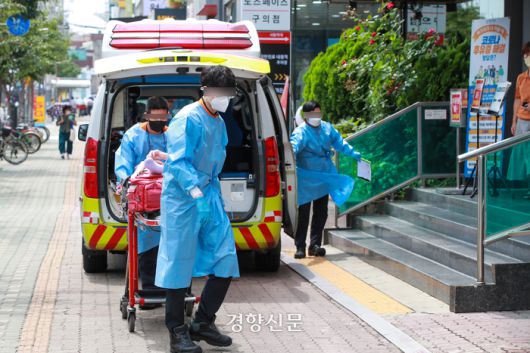 지난 7월27일 119구급대원들이 코로나19 거점병원인 서울 광진구 혜민병원으로 코로나 19 환자를 옮기고 있다. 이준헌 기자 |