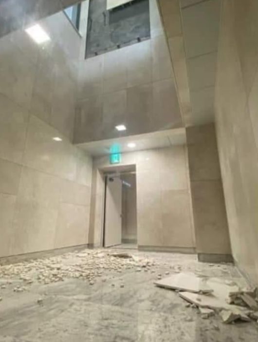 사고 상황이 담긴 사진을 보면, 떨어진 대리석 마감재들은 지하 2층 바닥 공용공간으로 수직 낙하해 산산조각이 났다. 대리석이 떨어져나온 공간에는 회색빛의 콘크리트가 그대로 노출된 상태다.