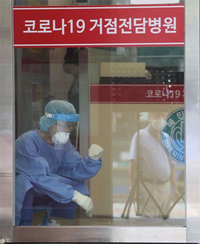 1일 서울 광진구 혜민병원에서 관계자가 주저앉아 밖을 응시하고 있다. [사진 = 연합뉴스] |