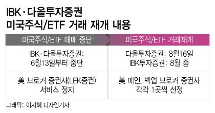 2일 IBK·다올투자증권 등에 따르면 지난 6월13일부터 매매가 중단됐던 미국 주식 및 미국 상장지수펀드(ETF) 거래가 재개된다. 다올투자증권은 오는 16일부터, IBK투자증권은 이번달 중으로 서비스를 재개할 예정이다.