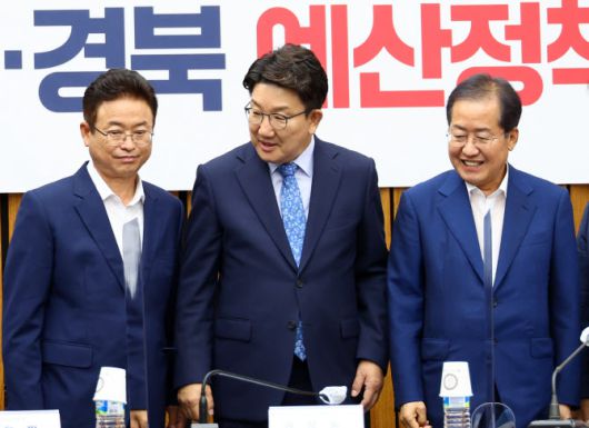 권성동(가운데) 국민의힘 대표 직무대행 겸 원내대표와 홍준표(오른쪽) 대구시장, 이철우 경북도지사 등이 지난달 20일 국회 본관에서 대구·경북 예산정책협의회에서 기념촬영을 하고 있다. (사진=국회사진기자단) |